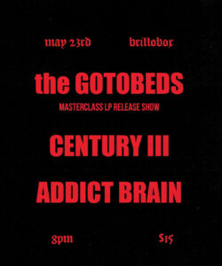FRIDAY MAY 23RD. 8PM/$15 GOTOBEDS RECORD RELEASE!!! W/ CENTURY III/ ADDICT BRAIN Event Details Date: May 23, 2025 8:00 pm – 24, 2025 2:00 am